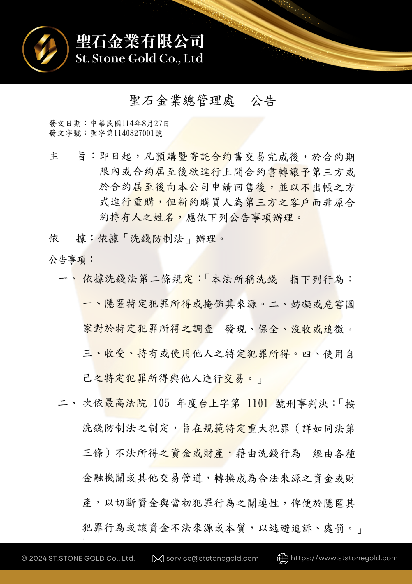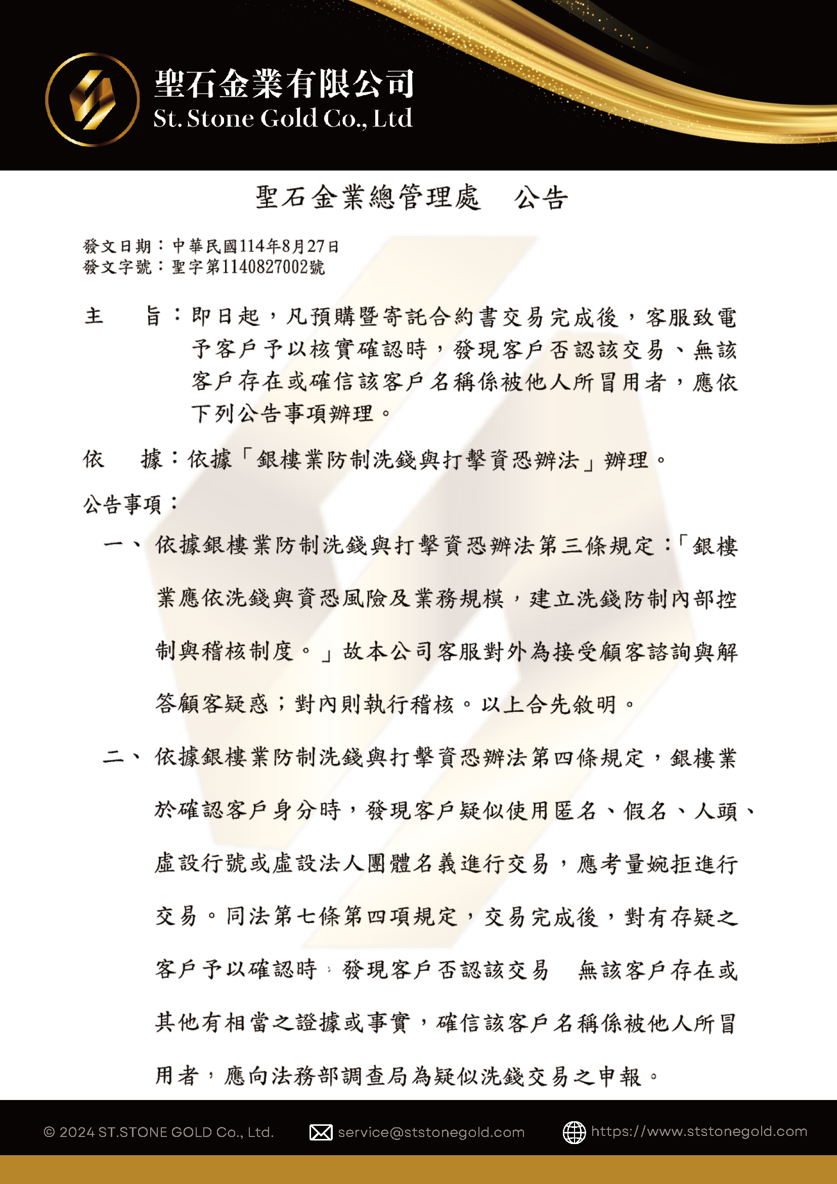 【公告】聖石金業針對不實指控及媒體報導之聲明