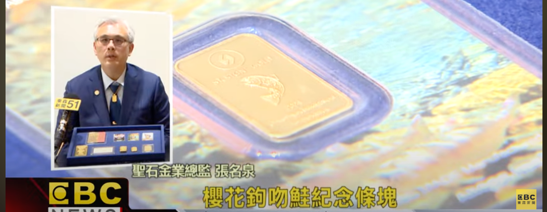 聖石金業總監張名泉:「櫻花鉤吻鮭紀念條塊,除了它是一個藝術品之外,那我們更希望藉由黃金作為媒介,把台灣的美傳遞到世界每一個角落,讓櫻花鉤吻鮭在我們的努力下,持續綻放光芒。」