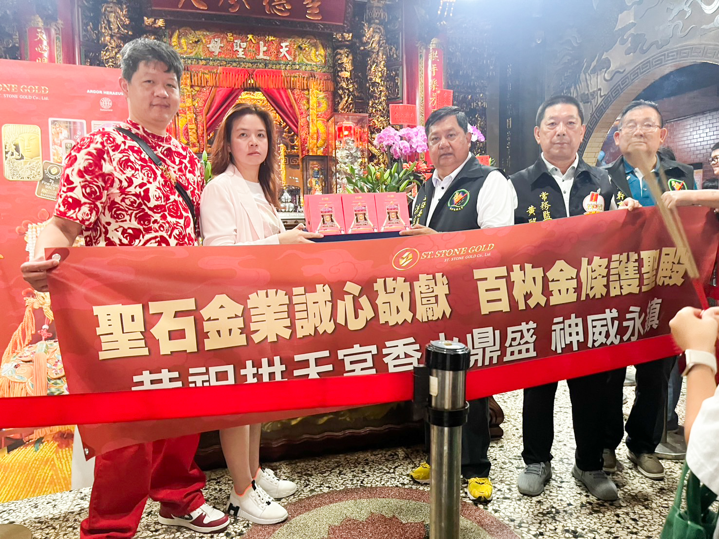 每年五月「白沙屯媽祖進香」是宗教界盛事,今年香燈腳人數超過30萬人史上最高。聖石金業集團今年向白沙屯拱天宮取得授權後,推出獨具文化與收藏價值的「白沙屯媽祖」瑞士精品紀念黃金條塊,為了履行還願承諾,特於8月9日在苗栗拱天宮隆重舉行「百金敬獻儀式」,敬獻100枚純度999.9重量2公克的白沙屯媽祖紀念黃金條塊,象徵著對媽祖庇佑的感謝與祝福,並祈願台灣風調雨順、國泰民安。